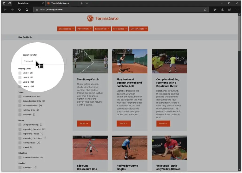 Keyword Search: TennisGate has a search bar in the sidebar where you can type in terms like “serve technique,” “volley drills,” or “footwork training” to quickly find relevant video content.