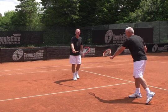 The return player starts with her back to the net. The server gives the command “Hopp” when throwing up the ball, whereupon the player quickly turns around and reacts to the ball to execute the return.